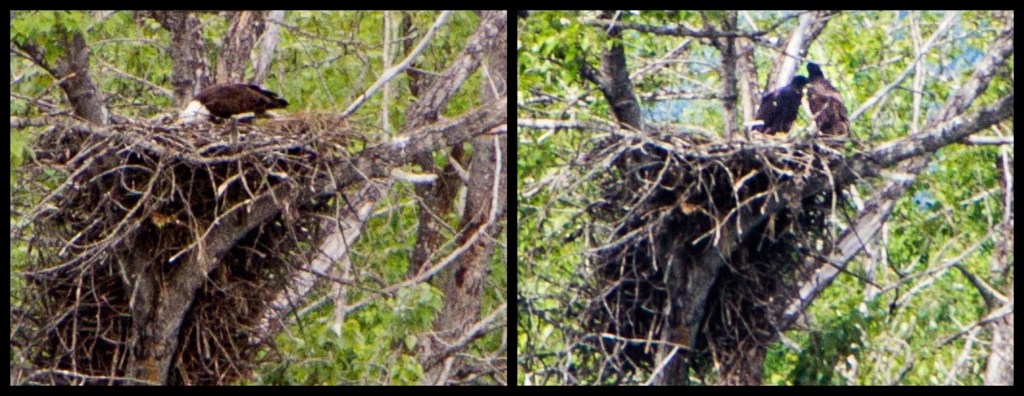 I first noticed the Twin Lakes eaglets during our memorial weekend visit at the end of May. I saw an adult bald eagle fly back to a nest that was a long distance from my location on the lake, but not so far that I couldn’t see the adult tending to the nest (presumably feeding hatched eaglets). On my return to the lake during the July 4 holiday I saw a pair of eaglets standing on the edge of the nest. They never left the nest and I assume they were only days away from taking their first flight.