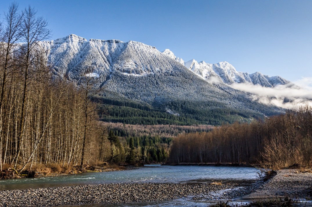 Once a month I work near the small town of Darrington, Washington. To get there I travel along the picturesque Highway 530. The road is nestled in the Upper Stillaguamish River valley at the foothills of the Cascade Mountain Range. During my hour drive I witness indescribable beauty. I always have my camera in the car, but I’m often in a rush to make an appointment or get home, and I choose to keep driving. March 21, 2014 was another beautiful day. The hills were recently dusted with snow and looked as if a giant had sprinkled them with powdered sugar. A mist hung low, near tree level, but the sun was warm and brightly glistened off the North Fork of the Stillaquamish River. Again, my eye saw a photograph, but I was on a deadline and I kept driving. The image nagged at me though, and about a mile up the road I stopped, turned around and returned to preserve the scene.